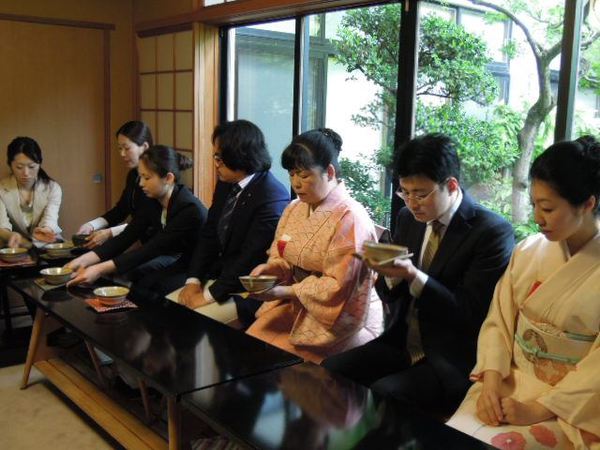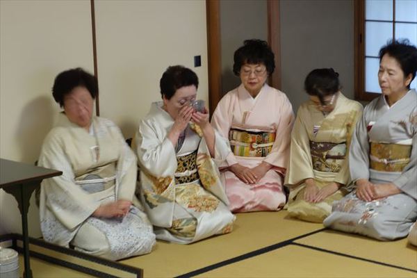 お茶を点てて頂きましたら、「お点前ちょうだいいたします」とお辞儀をし、右手で茶碗を取り、左手の上に乗せます。